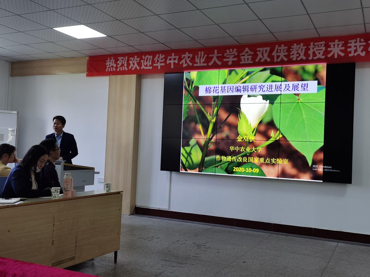 (通讯员 朱华国)10月9日上午,教育部 ”青年长江学者”,华中农业大学植物科学技术学院金双侠教授应邀在williamhill威廉希尔官网做了题为“棉花基因编辑研究进展及展望”的主题报告,学院总支书记刘世旺教授主持会议。