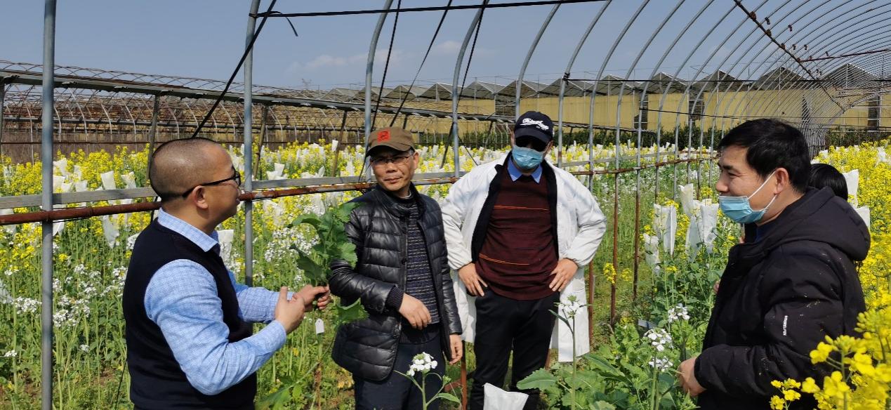 向福教授全面而详细介绍了有关富含维生素E特种油菜的深加工技术及产品开发近况,并结合两位黄州学者的疑问进行深入交流。张椿雨教授对与公司合作项目的研究进展十分满意,对项目后期工作也信心满满。随后,李世升副教授带领一行到作物育种基地查看各类种质材料。在基地,栗茂腾教授结合实物分享了在油菜种质保存与创新上的研究进展,特别介绍了萝卜味油菜苔、水果味油菜苔及抗癌型油菜苔的新型油菜品系,栗茂腾教授表示上述新型材料开发是经多年来精心研究的来之不易的科研成果,一定会助力中国乡村振兴与大健康研究。